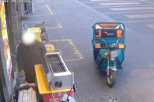 大娘开着三轮车来到烧烤摊前,顺手把煤气罐放到车上带走