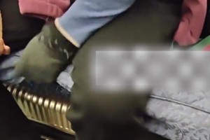女子在火车上觉得袜子有点湿,便把袜子套在手上在坐垫上揉搓